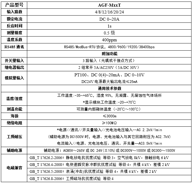 AGF-T穿孔式光伏汇流采集装置是专门应用于智能光伏汇流箱,用于监测光电池阵列中电池板运行状态,组串电流测量,汇流箱中防雷器状态采集、直流断路器状态采集、装置带有RS485接口可以把测量和采集到的数据和设备状态上传。