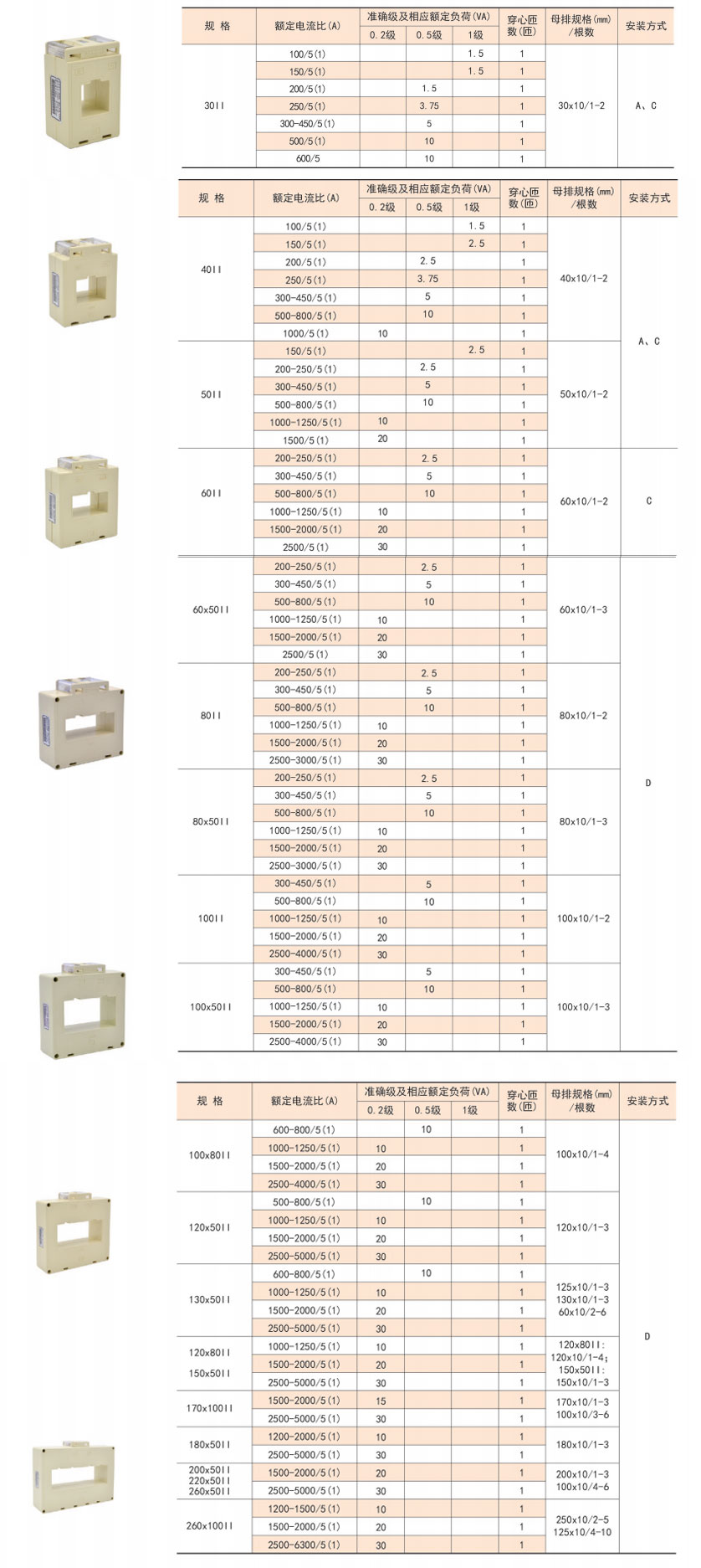 功能: 该系列互感器作为交流电流信号采集元件,可与测量仪表配套使用,一次电流测量范围5-6300A,二次输出5A或1A,测量范围为额定值的5-120%。 应用范围: