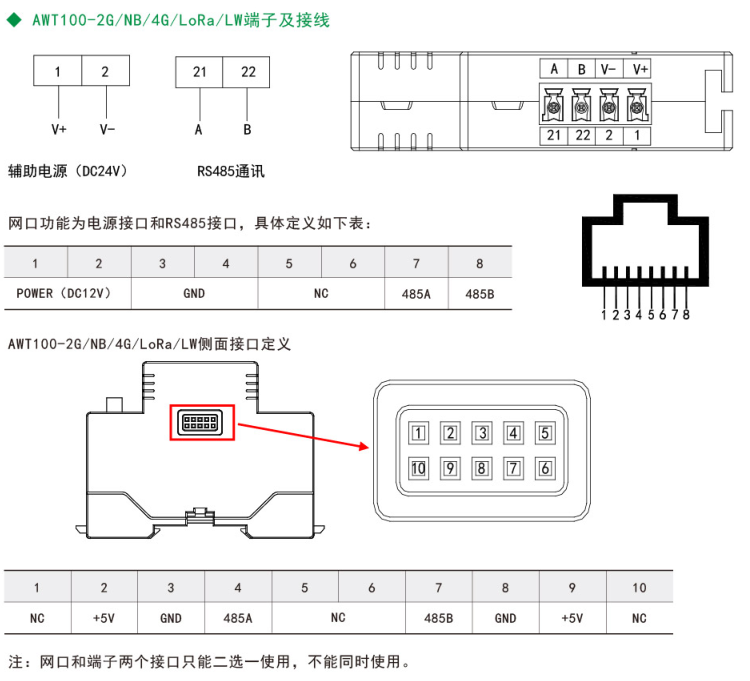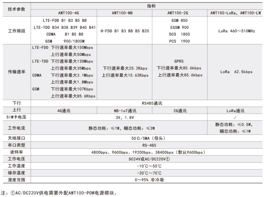 注:①AWT100-2G/NB/4G无线通信终端能通过安科瑞平台协议与安科瑞服务器通讯。
