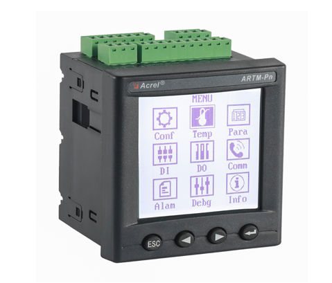 ARTM8温度巡检仪:ARTM系列温度巡检测控仪适用于一路或多路温度的测量和控制,主要应用于火电厂、水电站等场合的温度巡检测量及控制。测量8通道Pt100温度,也可以屏蔽其中任意通道。每一通道温度测量对应2段报警,继电器输出可以任意设置报警方向及报警值。