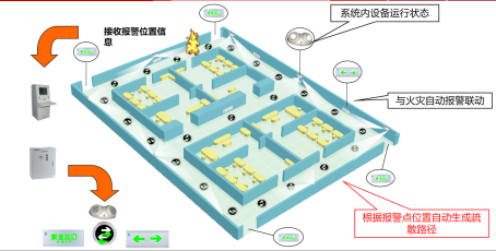 消防应急照明和疏散指示系统配合火灾报警控制器的使用,在危急时刻,能够快速针对风向、就近出口、火灾的走势、人群密度做出分析,给出安全的疏散路径指示,智能打开消防应急标志灯的指示方向以及应急照明灯,帮助建筑内的人群实时地选择更佳逃生路线,指引安全逃生方向,很大限度的保障群众的人身安全。该系统主要应用于机场、轨道交通、隧道、客运枢纽、医院、学校、体育馆、展览馆、酒店、商业楼盘等场所。