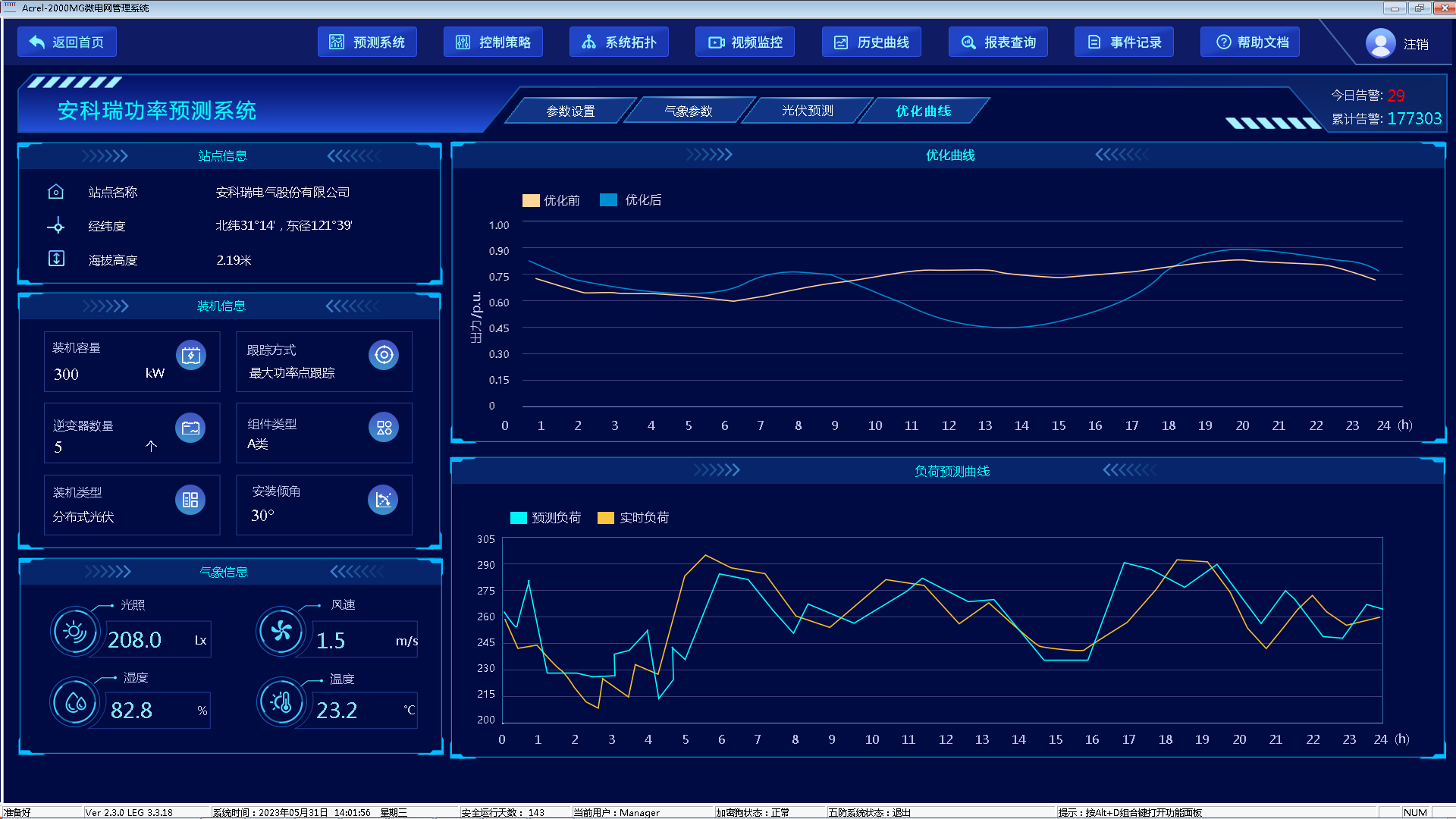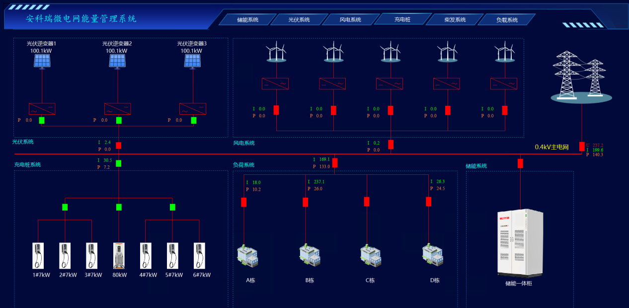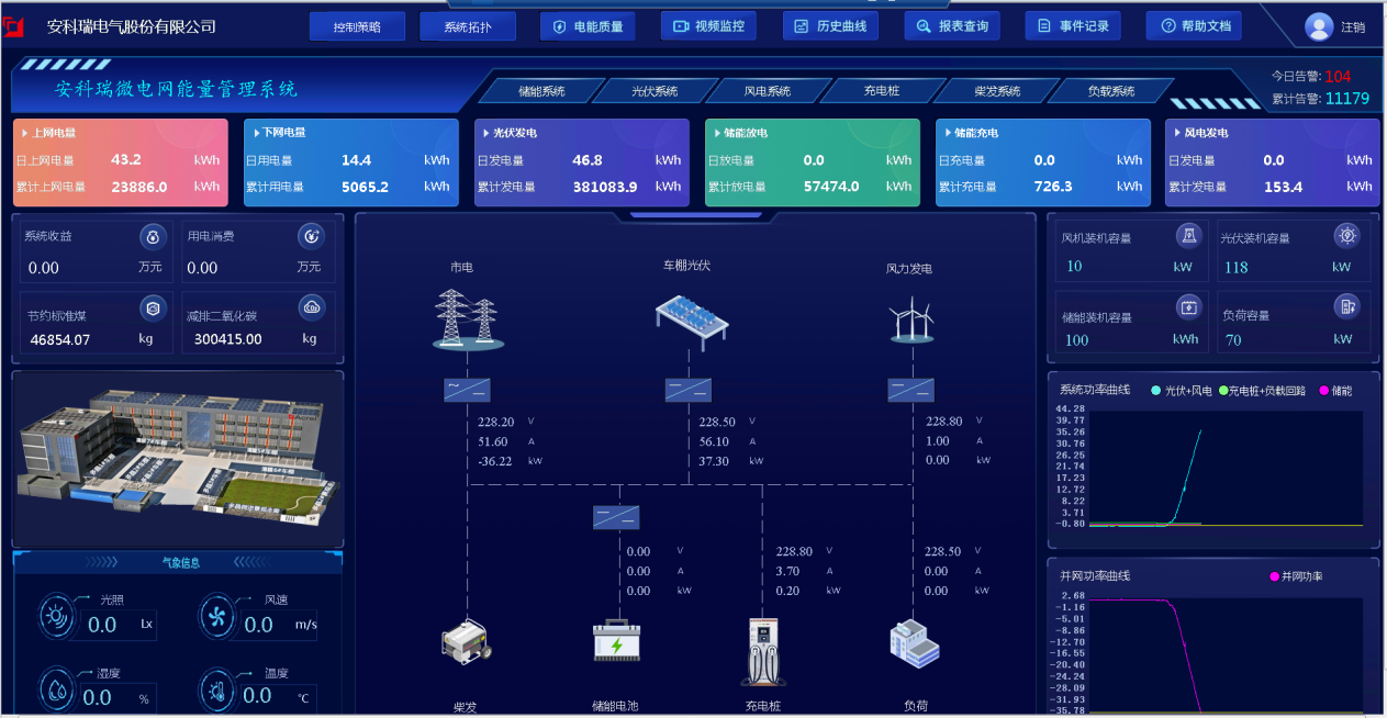 对微电网的运行进行实时监管,包含市电、光伏、风电、储能、充电桩及用电负荷,同时也包括收益数据、天气状况、节能减排等信息。