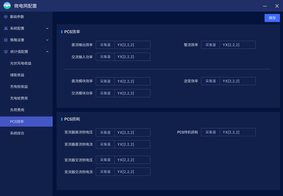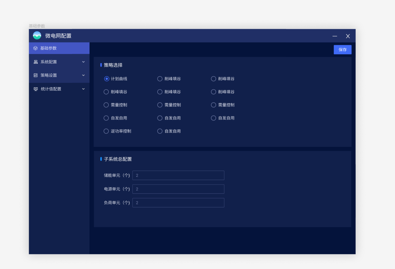 微电网配置主要对微电网系统组成、基础参数、运行策略及统计值进行设置。其中策略包含计划曲线、削峰填谷、需量控制、新能源消纳、逆功率控制等。