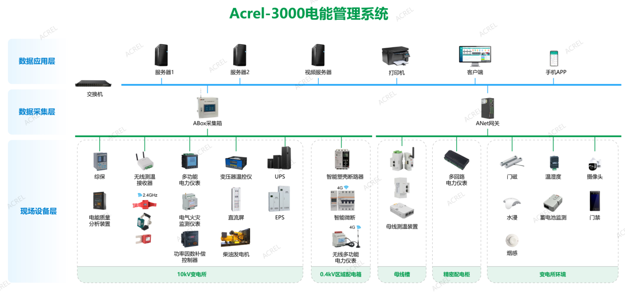 Acrel-3000电能管理系统通常采用分层分布式结构进行设计,即现场设备层、网络通讯层和站控管理层: