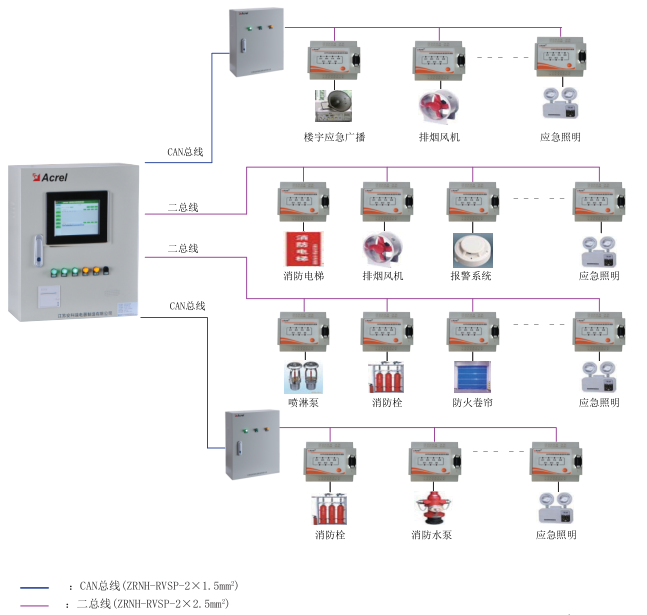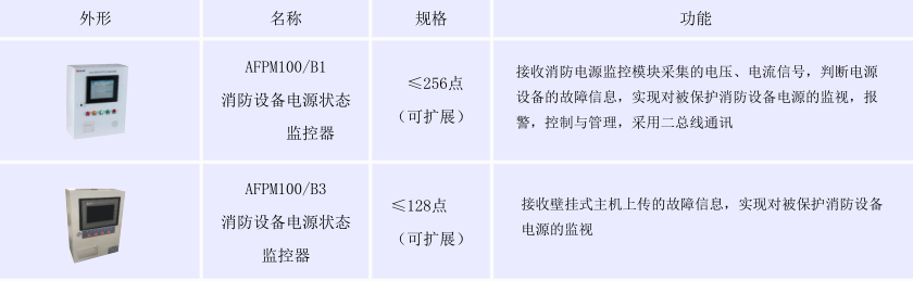 AFPM100消防设备电源监控系统采用AFPM100/B1消防设备电源状态监控器+区域分机+电压电流传感器三层结构组网模式,适用范围广,满足各种环境的现场,便于区域化管理,传感器与监控器之间采用二总线通讯,监控器与分机之间采用CAN总线通讯,满足了通讯实时性高的要求。