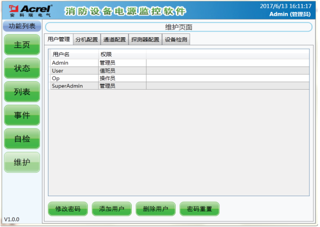 该界面可添加新的“操作员”和“值班员”权限的新用户,也可删除这两个级别的现有用户,该管理功能只有“超级管理员”和“管理员”可进行操作。