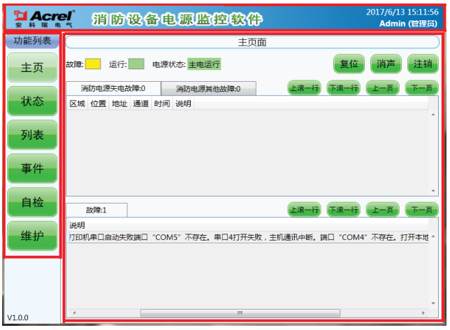 包含“软件标题区”、“功能列表区”、“页面显示区”三部分,可以通过点击“功能列表区”内按钮进入各相关功能界面。