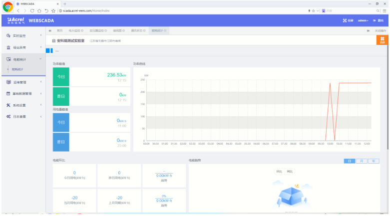 能耗统计页面显示各回路的功率峰值和用电量峰值,功率、电能趋势曲线,电能环比, 用电排名。