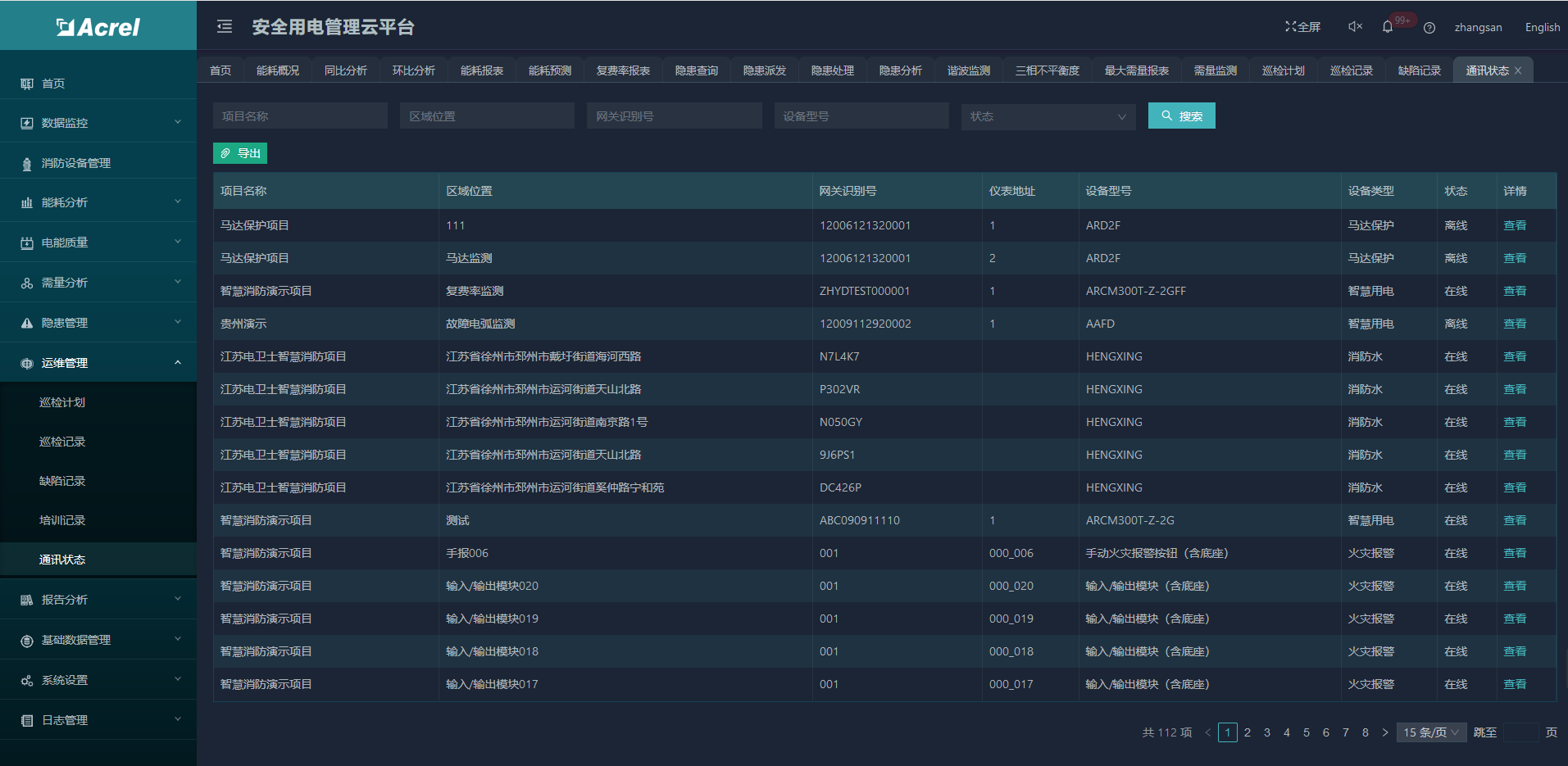 通过对项目、探测器ID以及想要查询的设备来进行查询,对现有项目下设备的通讯状态数据进行汇总罗列展示,包括显示设备当前的通讯状态等,如图所示。