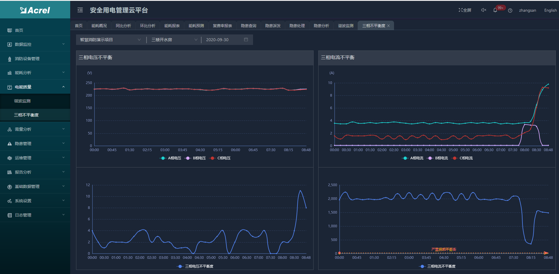 三相不平衡度包括三相电压不平衡度和三相电流不平衡度,支持查看当天的三相电流和三相电压的曲线图,并对应三相电流和三相电压的不平衡度,如图所示。
