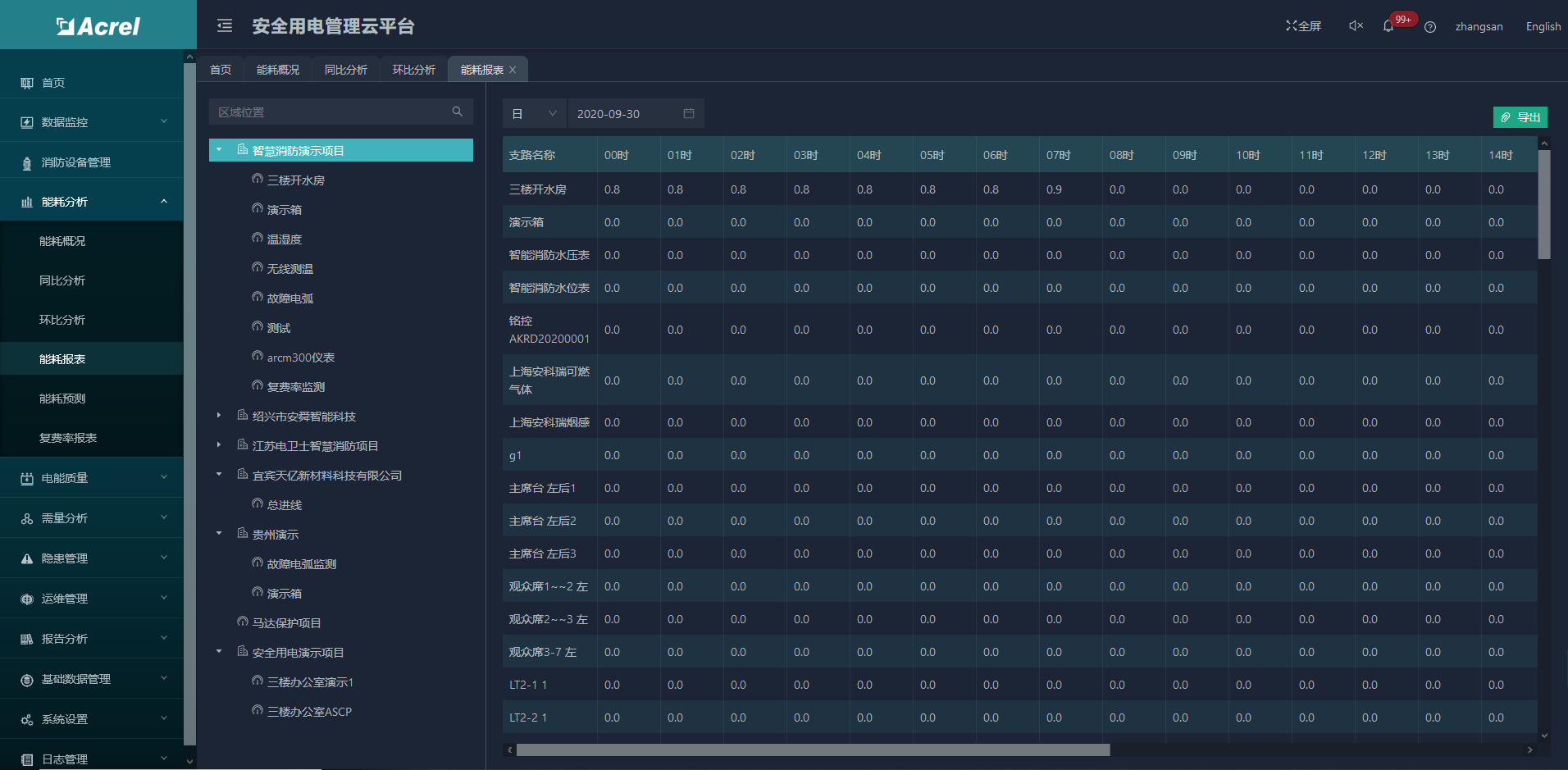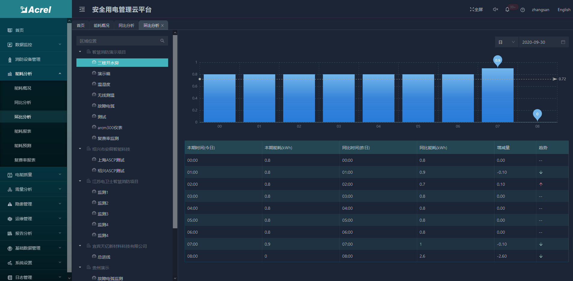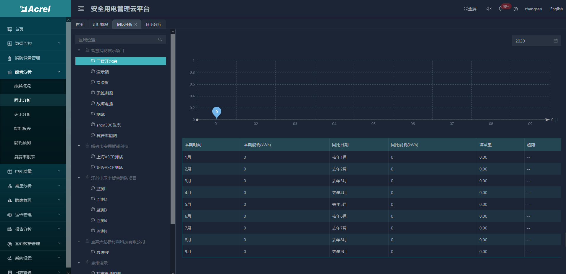 能耗分析包括能耗概况,同比分析,环比分析,能耗报表,能耗预测,复费率报表功能。