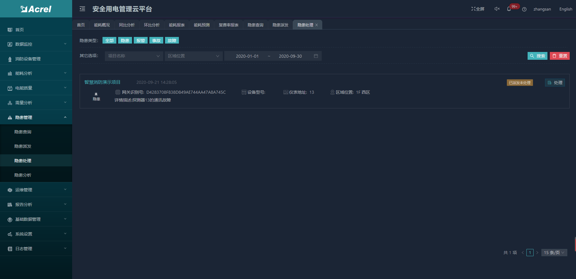 隐患处理页面显示派发到用户这边需要处理的隐患,如图所示。