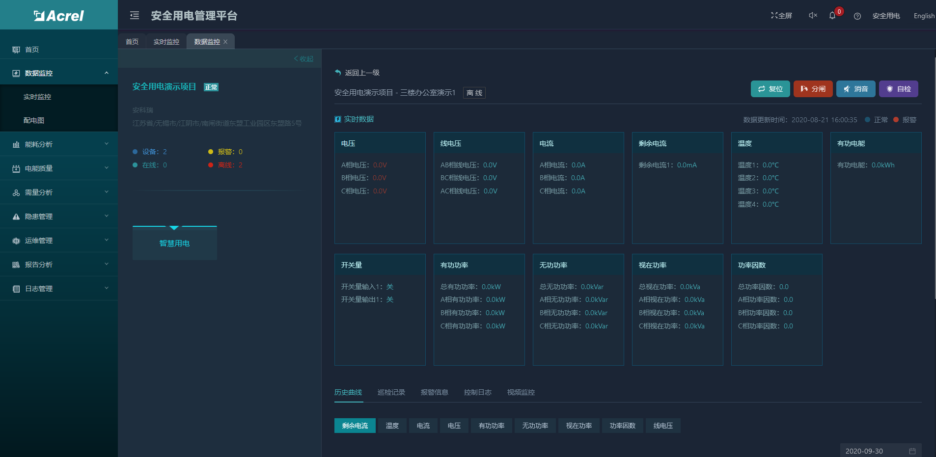 点击列表中的一个探测器进入到实时数据页面,可以查看探测器电参量实时数据,历史曲线,巡检记录,报警信息,控制日志,视频监控,支持对探测器进行远程控制,如图所示。