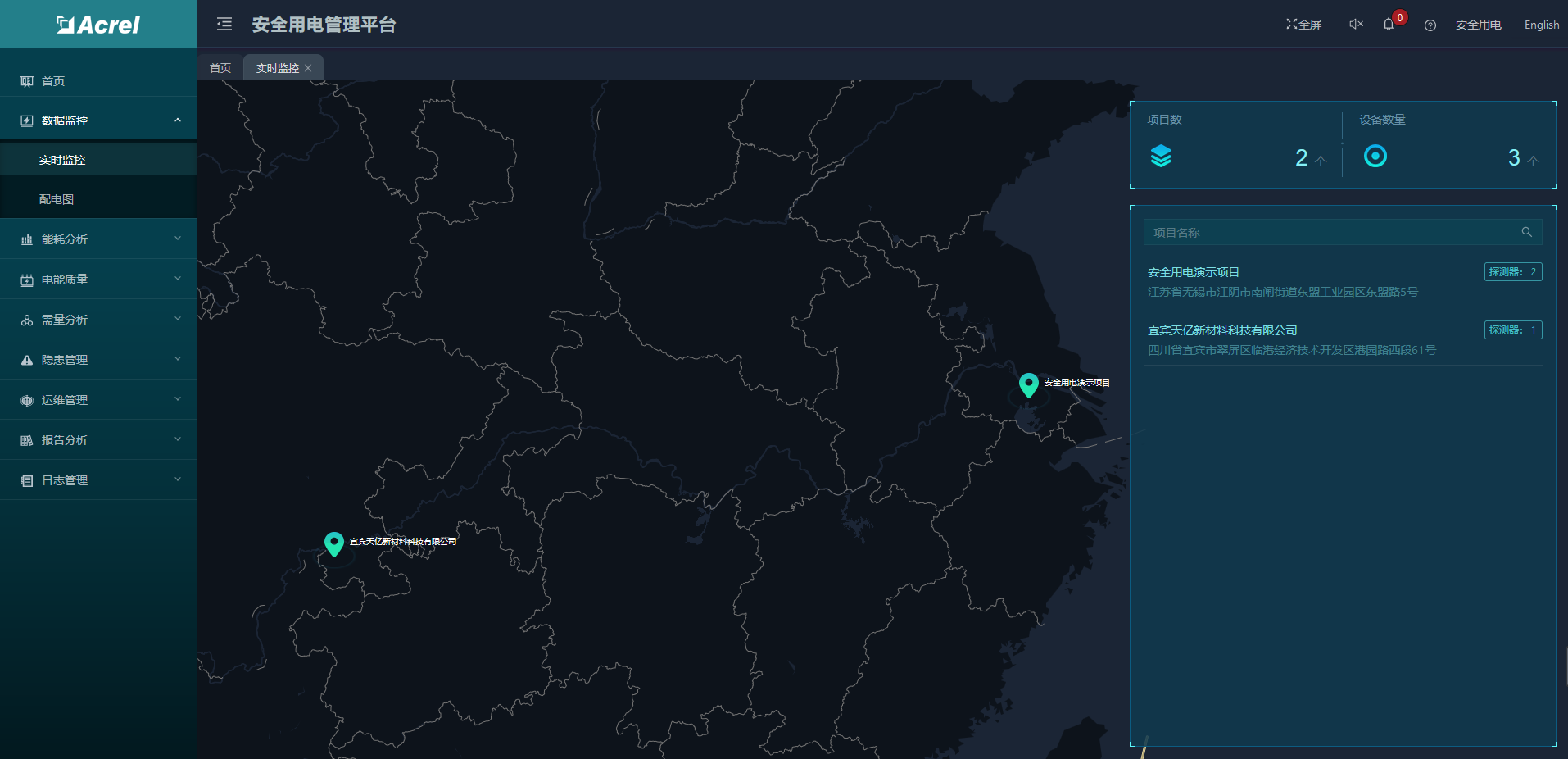 点击左侧列表实时监控进入实时监控页面,该页面展示了当前用户关联的项目数量,项目位置,探测器数量,如图所示。