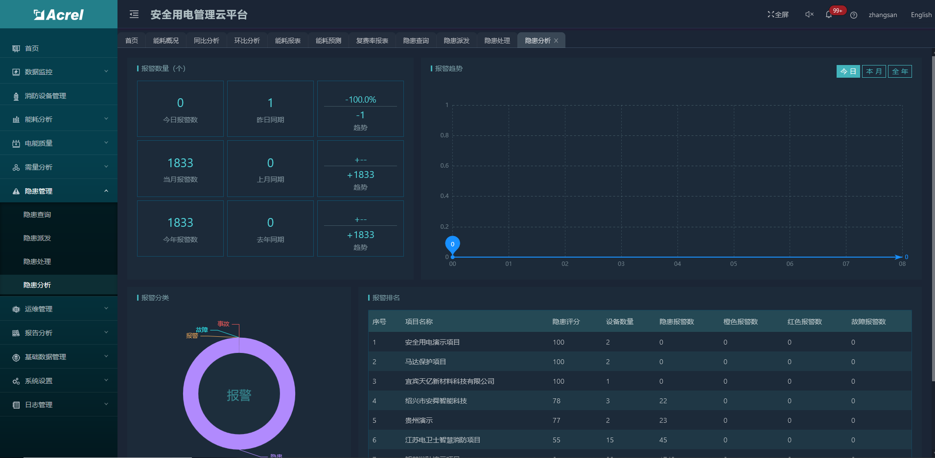 隐患分析支持对隐患记录进行日、月、年的维度查询,将项目下隐患以曲线,图表的形式展现,对各项目隐患进行排名,如图所示。