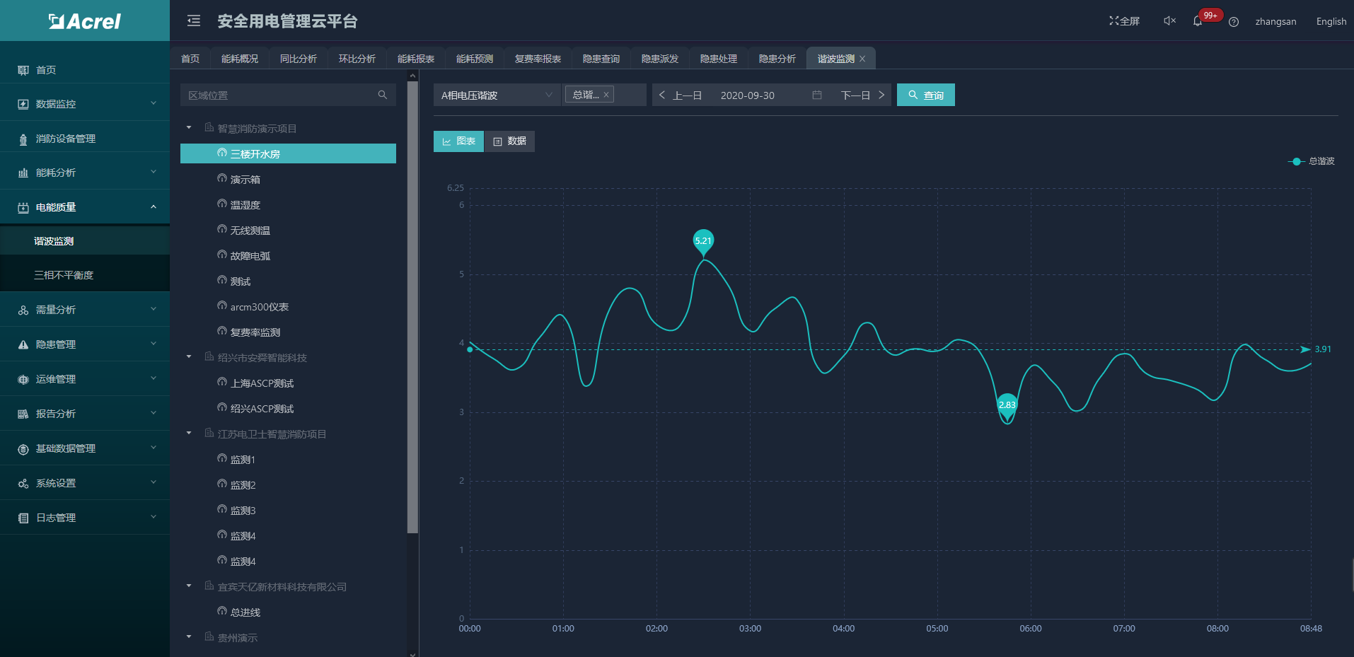 满足进线、大功率整流设备、变频设备、光伏发电输出等电压、电流进行在线谐波频谱分析,支持对谐波进行逐日、逐月、逐年报表汇总,或自定义时间段查询功能,分析谐波畸变率及各次谐波含有率,如图所示。